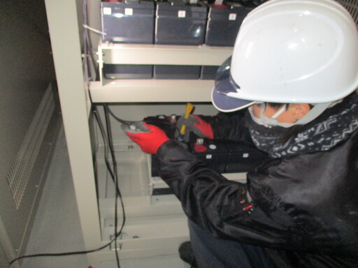 直流電源装置の蓄電池取替を実施しました。 制御用と非常照明用を2台同時に実施しました。 制御用は負荷停止ができない為、仮設蓄電池を設置し 負荷に電源を供給した状態で取替を行いました。 活線部には丁寧に絶縁養生を行い、短絡、感電等がないよう 十分安全に配慮して、ゼロ災害で取替をすることができました。