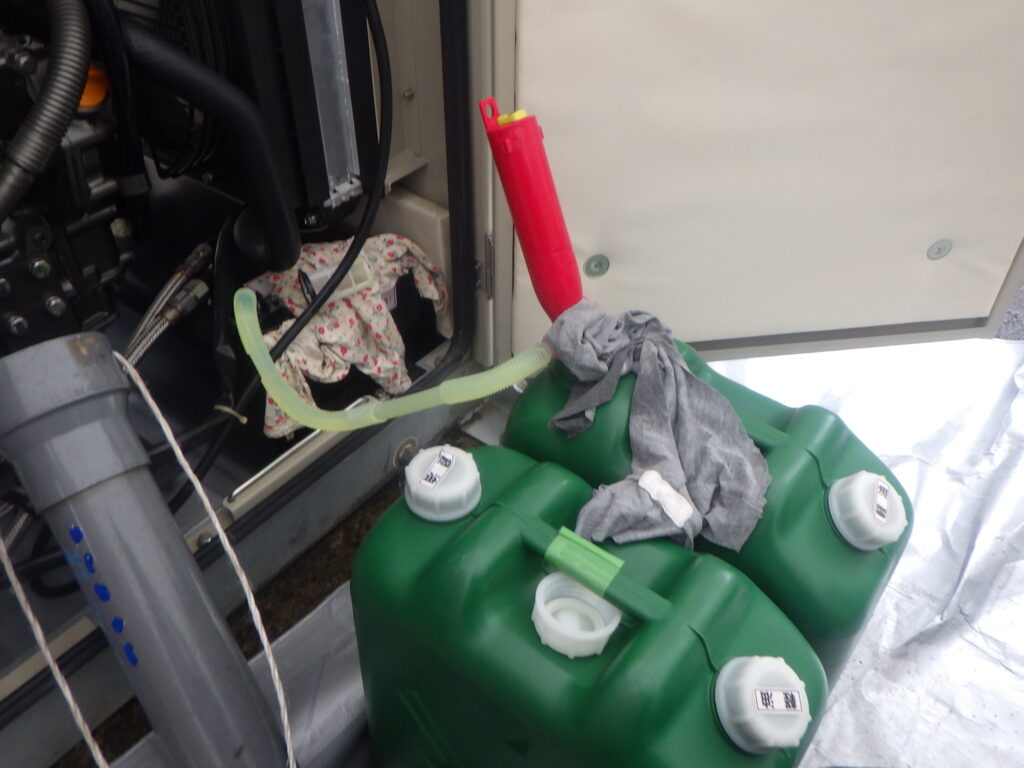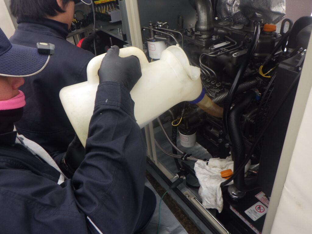 自家発電設備のエンジン整備を実施致しました。エンジンオイル、クーラント、各フィルター(オイル、燃料、油水分離)、燃料(軽油)抜替の簡易整備を実施致しました。整備内容は軽い内容でしたが、雨が降っており、雨養生を張って、作業を行いました。整備後、試運転確認を行い、漏れがないことを確認し、作業を終了しました。